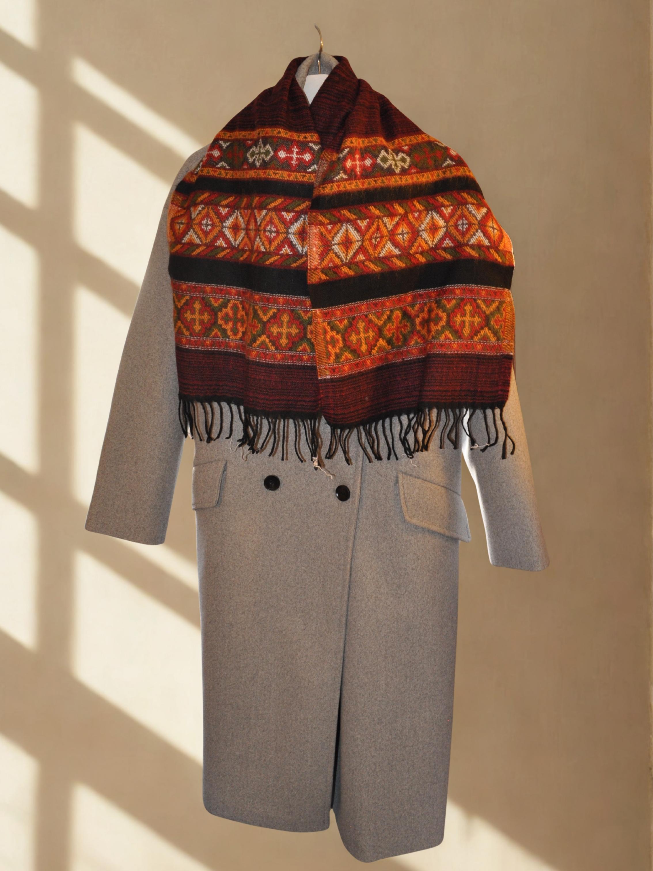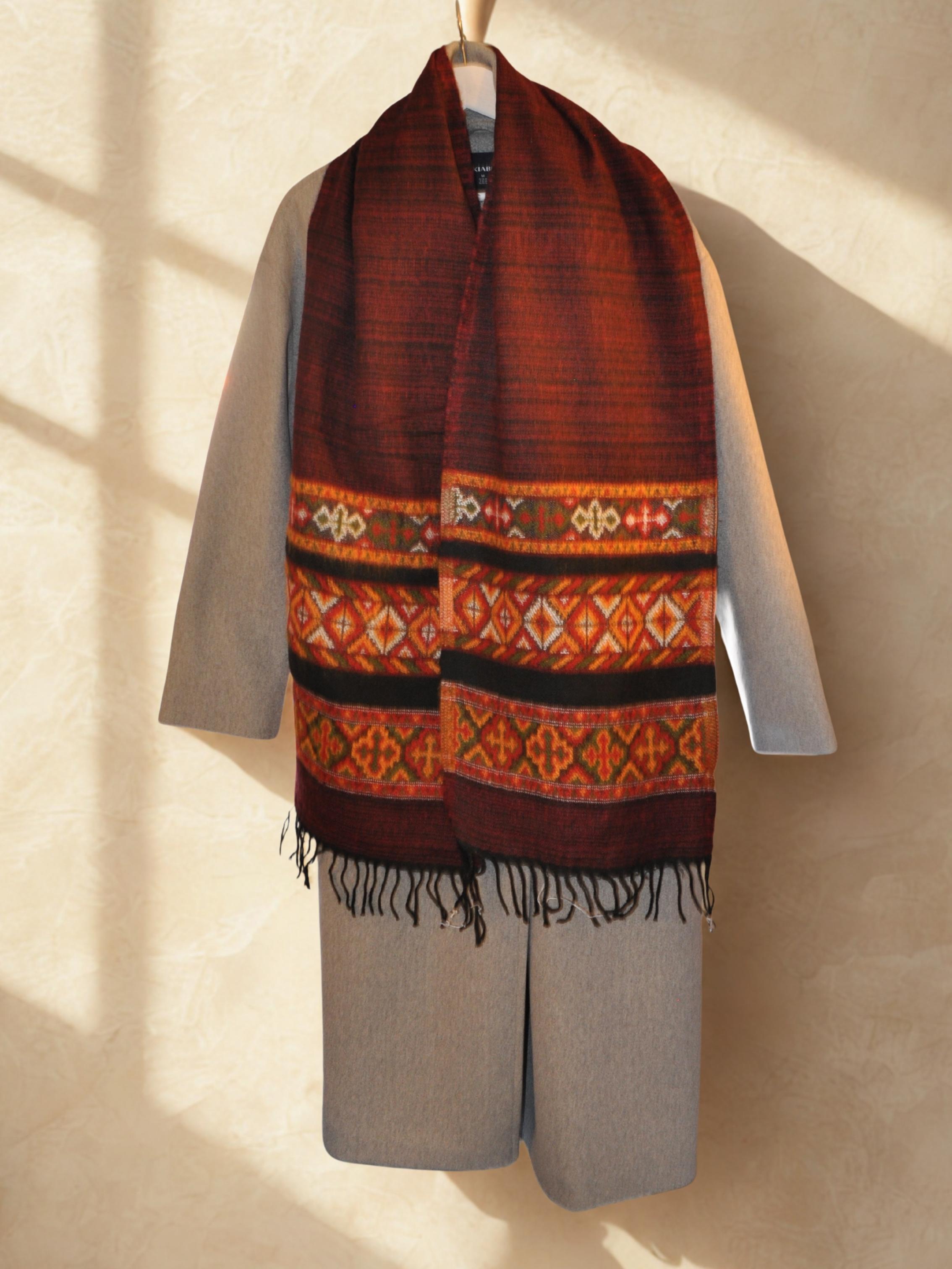 Écharpe en Laine de Yak, Motifs Ethniques et Franges Style Chaleureux et Confortable Accessoire Élégant 180x31 cm