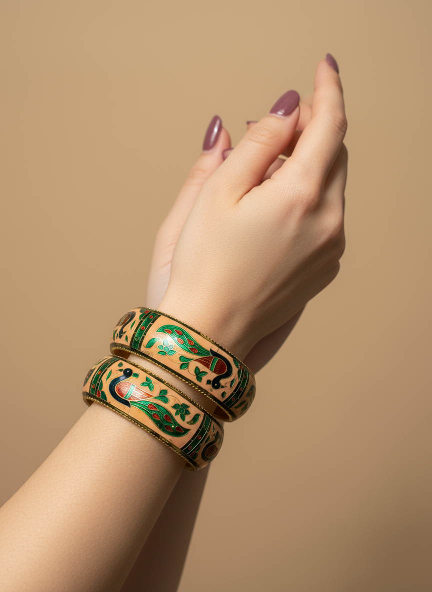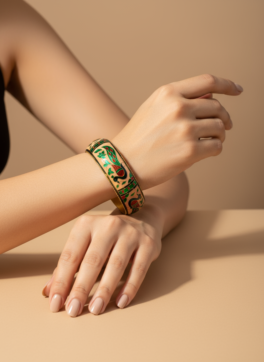 Bracelet peint à la main, bracelet rigide émaillé – Élégance dorée et esprit ethnique