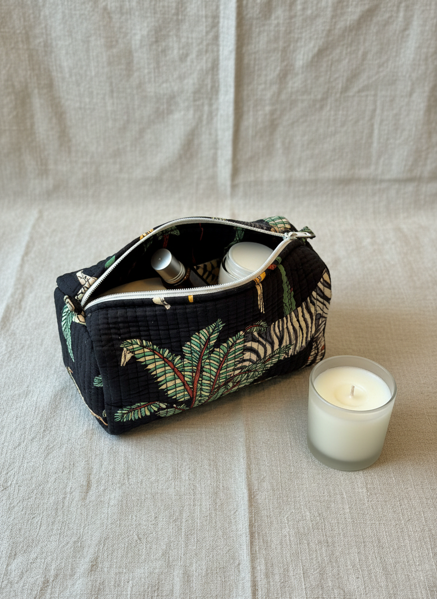 Magnifique ensemble de trois trousses matelassées en tissu coloré, motif exotique.