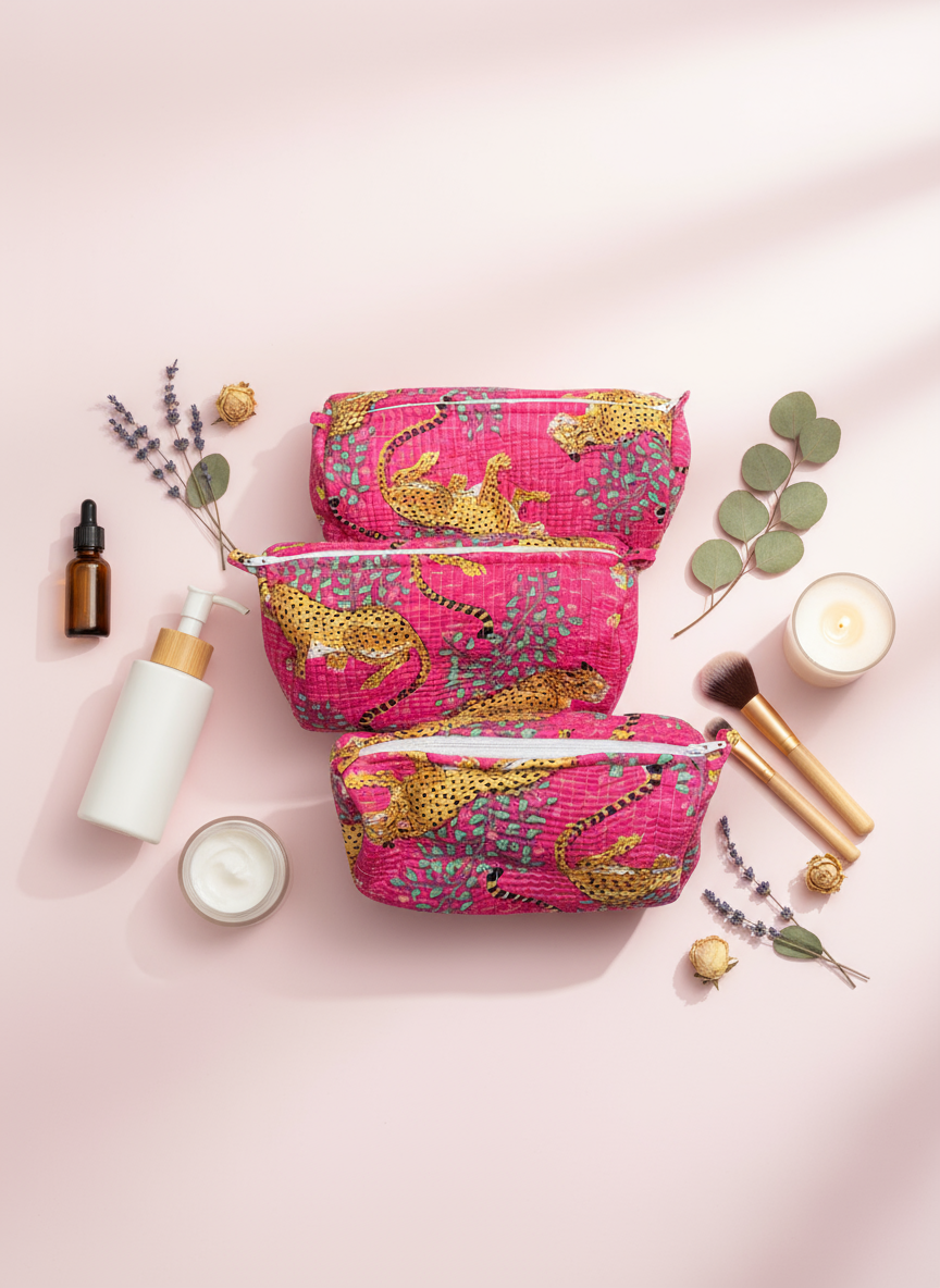 Magnifique ensemble de trois trousses matelassées en tissu coloré, motif exotique.