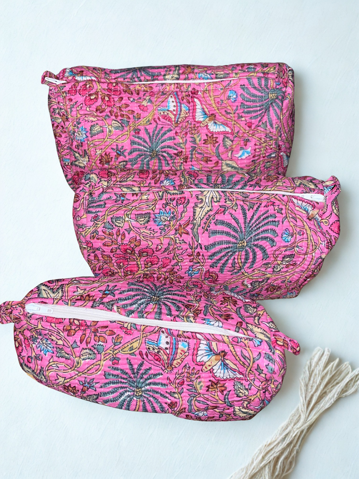 Magnifique ensemble de trois trousses matelassées en tissu coloré, motif exotique.